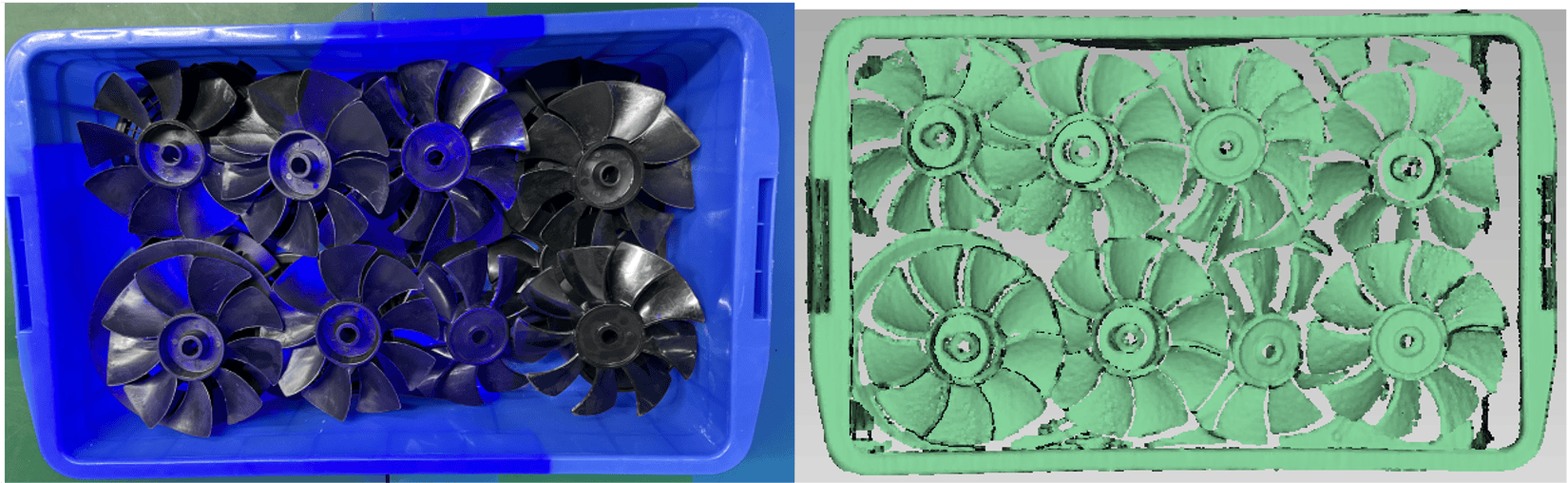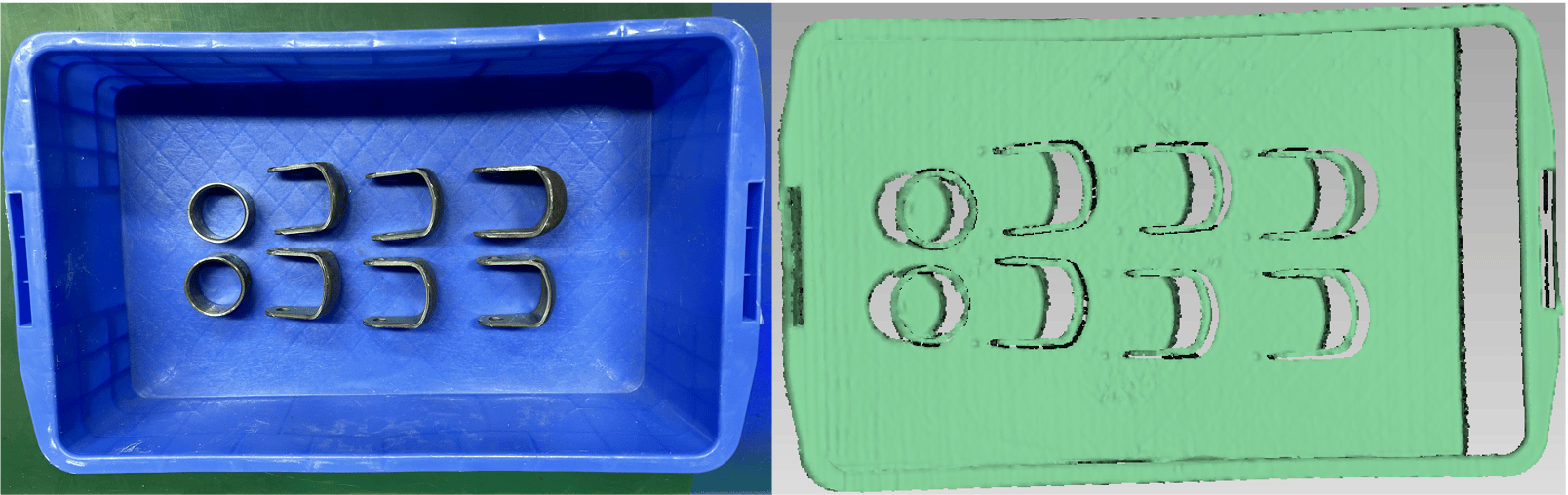 PIXEL 系列下载PIXEL L(NEW)PIXEL XL 核心优势 超高的点云完整度:擅长薄壁高反等复杂工件 重复精度高:0.03mm@1200mm 超宽的景深与视野:工作最大距离3800mm,fov达 70° 强大的抗环境光干扰能力:出光功率>1w,户外可用 稳定可靠:IP65防护等级,可应对粉尘、潮湿、电磁干扰、高温等复杂情况 型号/视场 点云展示 黑色吸光、高反光、薄壁等复杂工件都可呈现平整、完整的点云(点击图片查看大图) 应用领域 用于深框抓取、无序抓取等场景 用于深框抓取、无序抓取等场景 已取得认证 CE、FCC